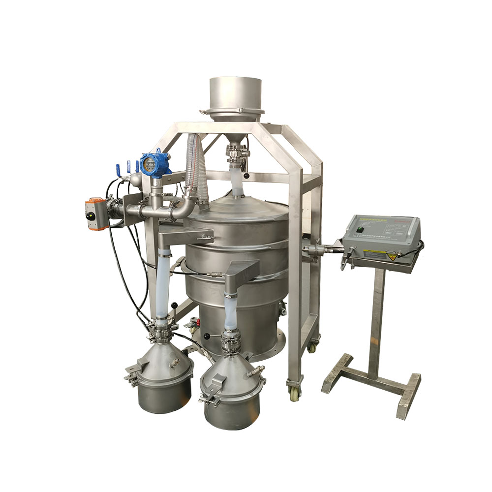 气体保护筛,是针对在筛分过程中有些物料不能与空气接触,否则就会发生氧化或爆炸。所以在筛分过程中,筛机、料仓、收料斗呈完全密封状态,同时需要充入惰性气体保护。筛分前对筛机、接料仓,管道内进行气体置换。氧含量低于设定值后,方可进行投料生产。启动旋振筛,同时打开超声波电源,打开放料阀,物料匀速投入超声波振动筛,进行精细筛分。在筛分过程中,氧含量检测仪实时监测设备内氧含量浓度,保证惰性气体保护物料。旋振筛利用振动电机作为激振源,通过振动电机上下两端的偏心重锤将旋转运动转变为水平、垂直、倾斜的三次元运动,并传递到旋振筛的筛面上;并且筛网可以叠加超声波高频振动,加快物料在筛网上的运动,可以解决粉体堵网,去除物料静电,根据不同物料筛分要求,在这个过程中,不同目数的物料通过各层对应目数的筛网后在各层的出料口排出,终实现筛选除杂或过滤分级的目的。调节上、下两端的相位角,可以改变物料在筛面上的运动轨迹。筛分结束后,关闭收料斗进料阀,关闭气体补气阀,分机停止,关闭超声电源。