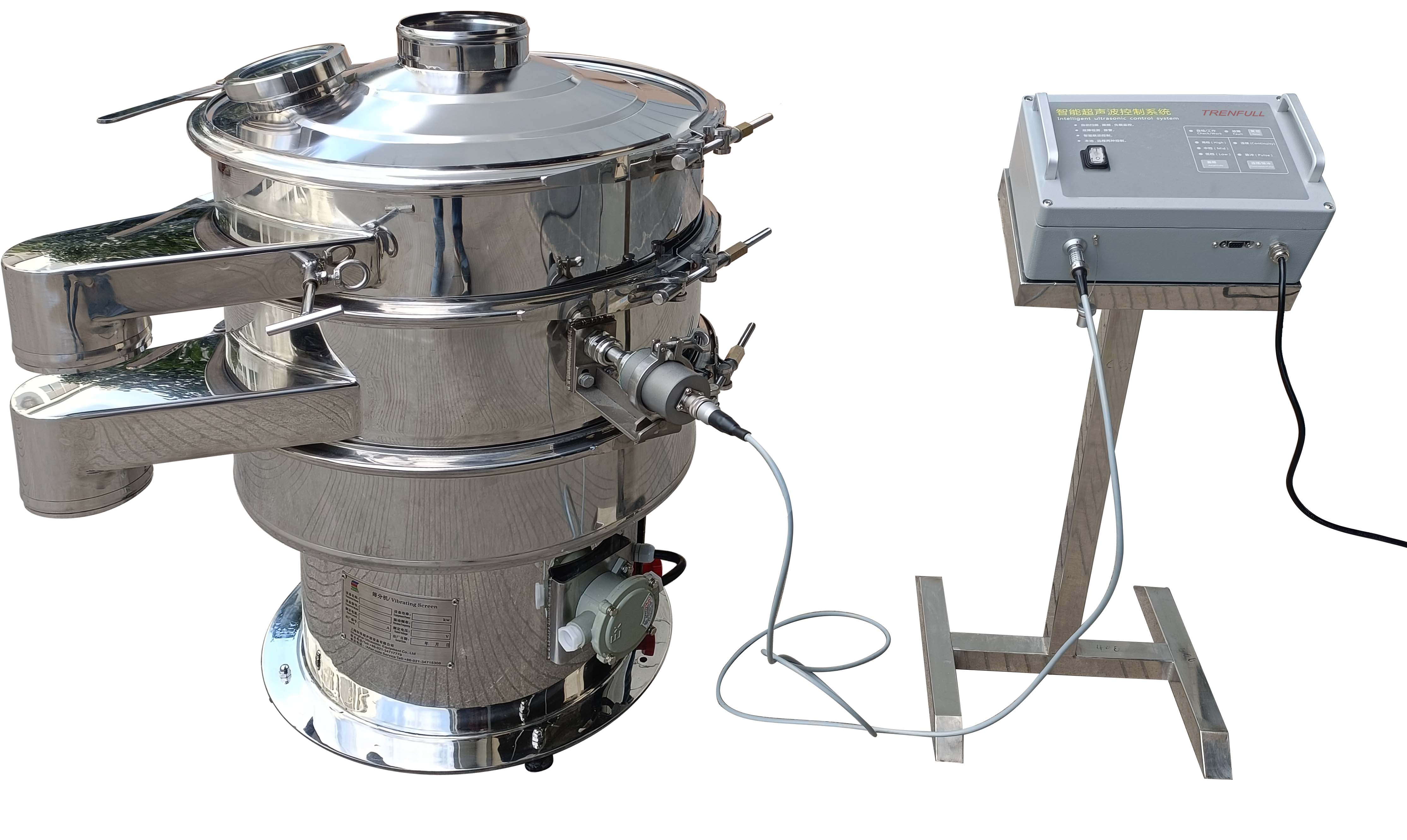 超声波旋振筛: 超声波谐振电源产生的高频电振荡由振荡器转换成高频三次元振荡波,这些振荡波传到共振环上使共振环产生共振,然后由共振环将振动均匀传输至筛面。筛网上的物料在做低频三次元振动的同时,叠加上超声波振动,既可防止网孔堵塞,又可提高筛分产量和质量。